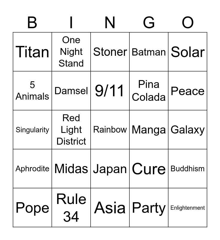 This bingo card has a free space and 24 words: Midas, Rule 34, 9/11, Pope, Solar, Titan, 5 Animals, One Night Stand, Manga, Japan, Pina Colada, Singularity, Cure, Buddhism, Damsel, Party, Galaxy, Stoner, Peace, Red Light District, Enlightenment, Aphrodite, Batman and Asia.
