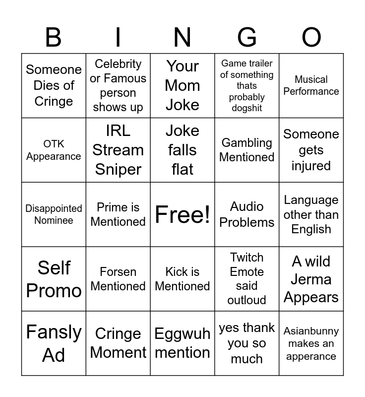 This bingo card has a free space and 24 words: Forsen Mentioned, Cringe Moment, Joke falls flat, Fansly Ad, Musical Performance, Someone Dies of Cringe, OTK Appearance, Celebrity or Famous person shows up, Audio Problems, Kick is Mentioned, Gambling Mentioned, Disappointed Nominee, Twitch Emote said outloud, A wild Jerma Appears, IRL Stream Sniper, yes thank you so much, Language other than English, Your Mom Joke, Someone gets injured, Prime is Mentioned, Asianbunny makes an apperance, Self Promo, Game trailer of something thats probably dogshit and Eggwuh mention.