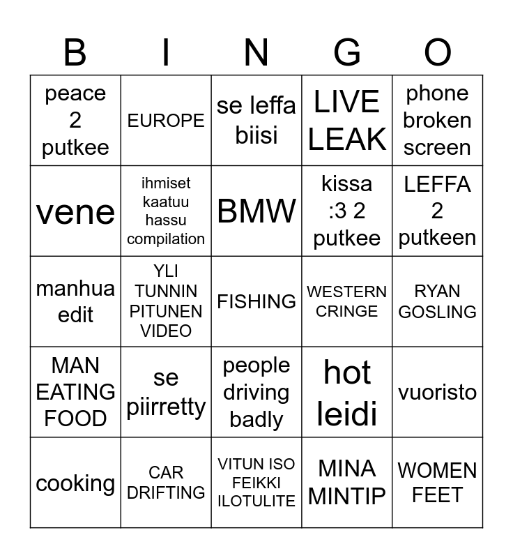 This bingo card has 25 words: se piirretty, VITUN ISO FEIKKI ILOTULITE, BMW, cooking, phone broken screen, peace 2 putkee, vene, EUROPE, WESTERN CRINGE, people driving badly, kissa :3 2 putkee, manhua edit, hot leidi, vuoristo, ihmiset kaatuu hassu compilation, WOMEN FEET, RYAN GOSLING, se leffa biisi, LEFFA 2 putkeen, YLI TUNNIN PITUNEN VIDEO, FISHING, CAR DRIFTING, MAN EATING FOOD, LIVE LEAK and MINA MINTIP.