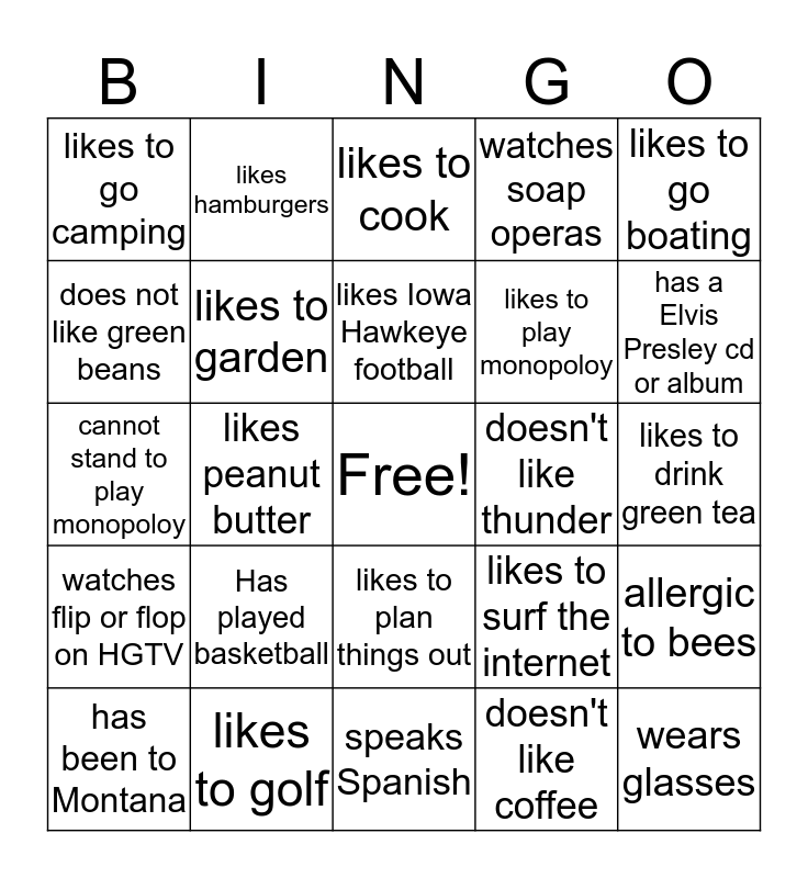 This bingo card has a free space and 24 words: Has played basketball, likes to golf, likes Iowa Hawkeye football, has been to Montana, likes to go boating, likes to go camping, does not like green beans, likes hamburgers, doesn't like thunder, likes to plan things out, likes to play monopoloy, cannot stand to play monopoloy, likes to surf the internet, allergic to bees, likes to garden, doesn't like coffee, likes to drink green tea, likes to cook, has a Elvis Presley cd or album, likes peanut butter, wears glasses, watches flip or flop on HGTV, watches soap operas and speaks Spanish.