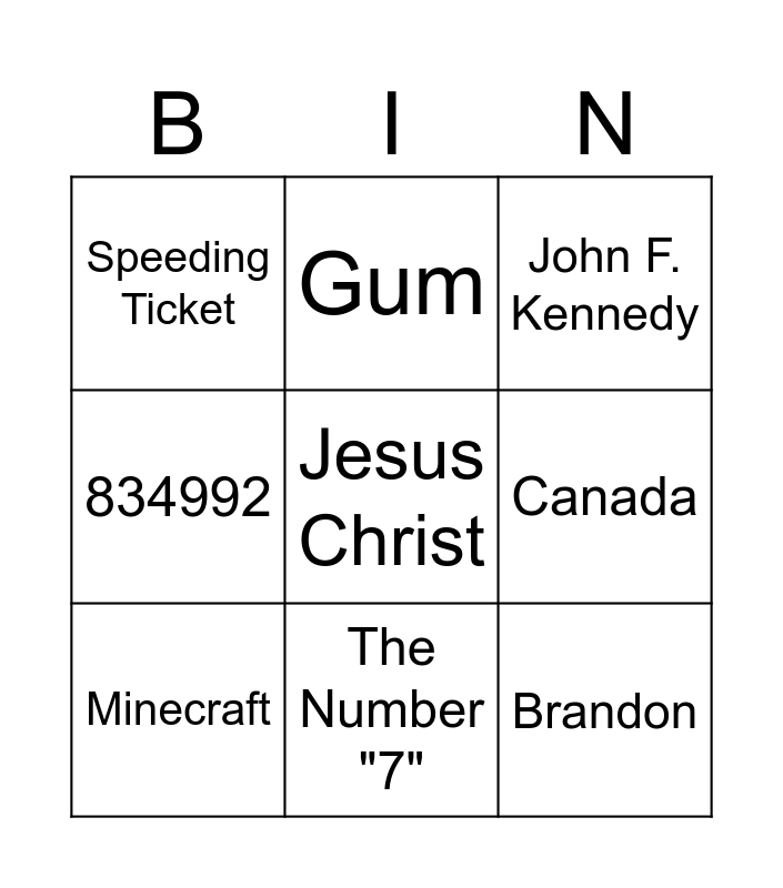 This bingo card has 33 words: Christmas, Horse, Pikachu, Chicken Broccoli Alfredo Pasta, Atlantis, Minecraft, Jesus Christ, The Transistor, Gum, Gold, The Number "7", John F. Kennedy, Bear (any kind works), Lava Lamp, The Moon, Depression, Infinite Craft, Dungeon and Dragons, Pepe the Frog, Any Pokemon, Super Glue, Spicy Meatball, Speeding Ticket, Data Science, Any chip flavour, Mario 64, 834992, Brandon, Canada, Uh-oh Stinky, Bruh, Meta and Blood.
