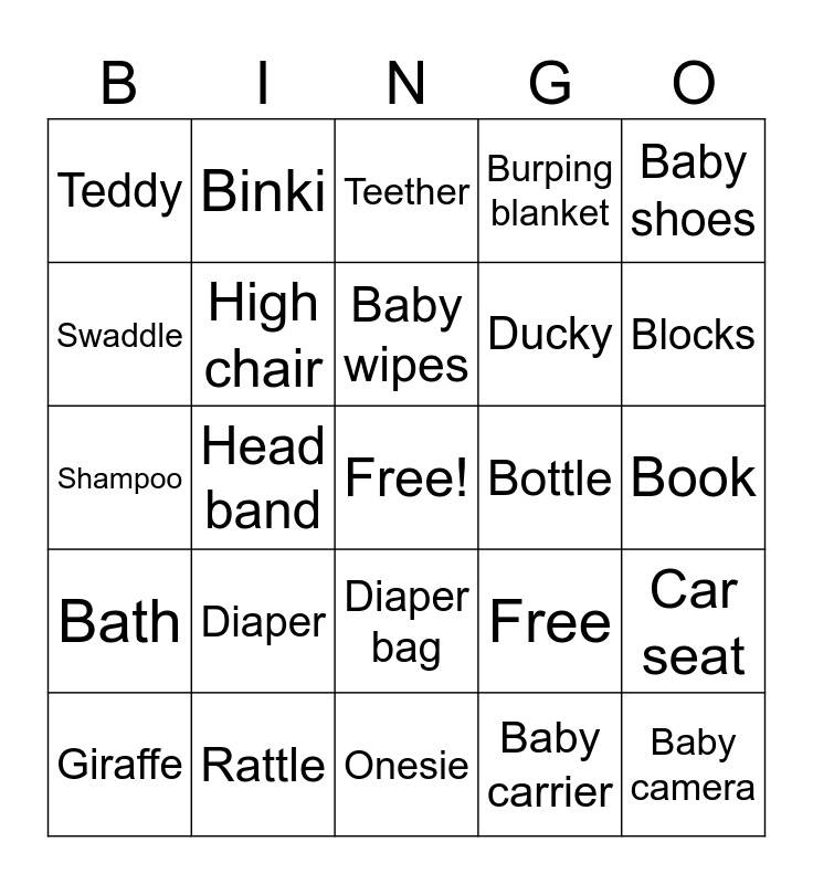 This bingo card has a free space and 25 words: Diaper, Onesie, Baby wipes, Giraffe, Baby shoes, Teddy, Swaddle, Binki, Bottle, Diaper bag, Ducky, Shampoo, Free, Car seat, High chair, Bib, Book, Teether, Blocks, Head band, Baby camera, Rattle, Bath, Burping blanket and Baby carrier.