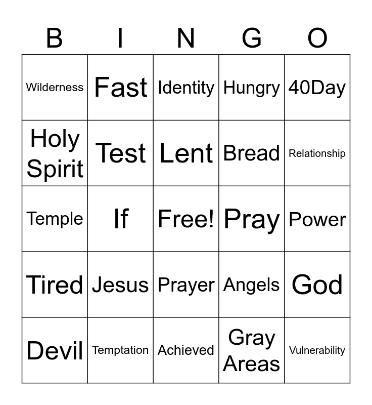 This bingo card has a free space and 24 words: Jesus, Temptation, Lent, Devil, 40Day, Wilderness, Holy Spirit, Fast, Pray, Prayer, Bread, Temple, Angels, God, Test, Gray Areas, Power, Identity, Relationship, If, Vulnerability, Tired, Hungry and Achieved.