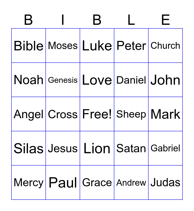 This bingo card has a free space and 25 words: Jesus, Grace, Love, Mercy, Church, Bible, Noah, Moses, Sheep, Lion, Daniel, Angel, Satan, Gabriel, Genesis, Revelation, Mark, Luke, John, Cross, Judas, Paul, Silas, Peter and Andrew.