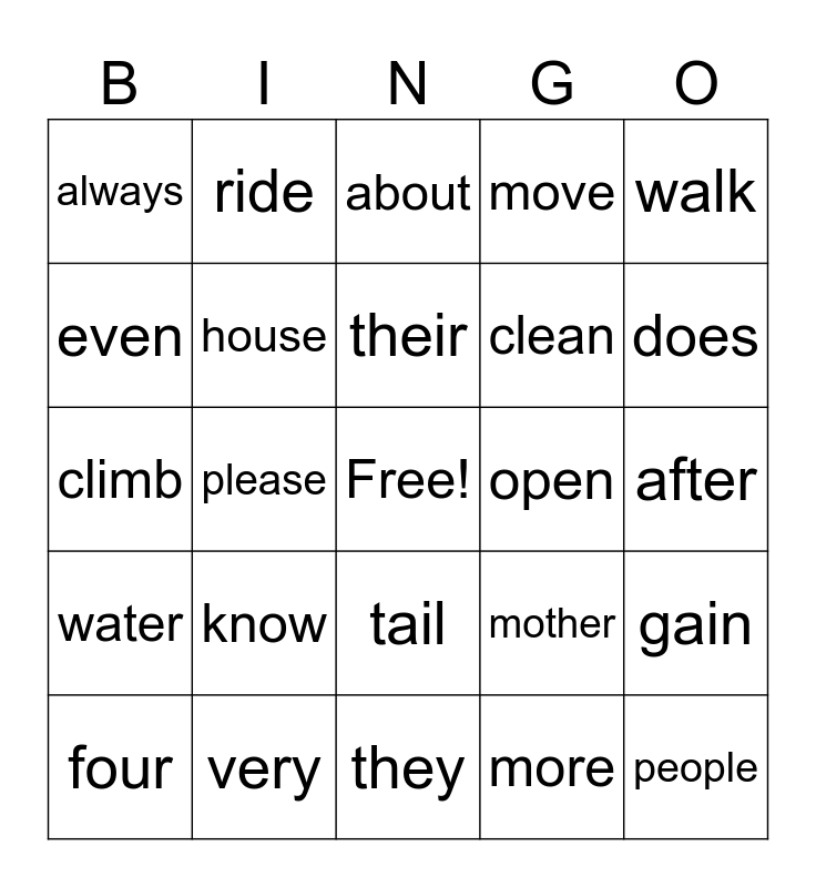 This bingo card has a free space and 24 words: know, very, their, four, walk, always, even, ride, open, tail, clean, climb, mother, gain, house, more, after, about, does, please, people, water, move and they.