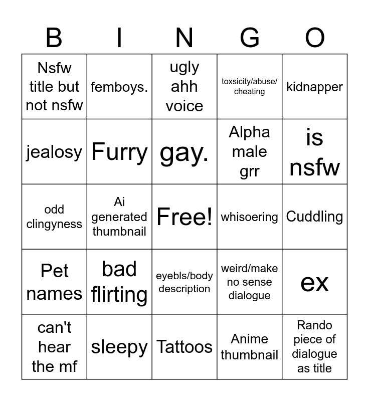 This bingo card has a free space and 27 words: weird/make no sense dialogue, forcing voice deeper, Alpha male grr, Tattoos, jealosy, ugly ahh voice, femboys., Pet names, whisoering, ex, odd clingyness, toxsicity/abuse/ cheating, can't hear the mf, sleepy, is nsfw, romanticized red flags, Furry, gay., bad flirting, Nsfw title but not nsfw, Cuddling, Anime thumbnail, Ai generated thumbnail, Rando piece of dialogue as title, eyebls/body description, kidnapper and alcoholism.