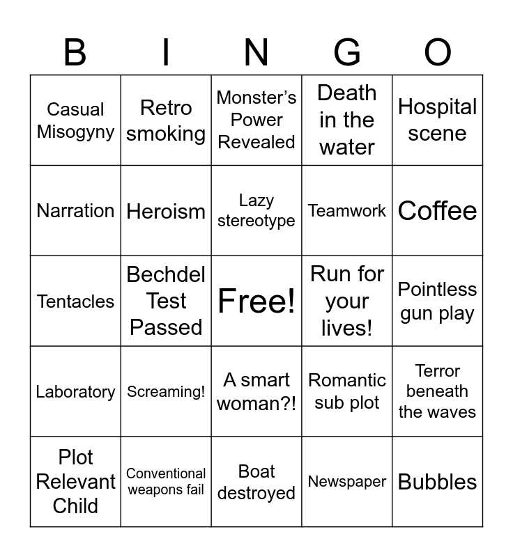 This bingo card has a free space and 29 words: Plot Relevant Child, Scuba Diving, Bechdel Test Passed, A warning Ignored, Casual Misogyny, Monster’s Power Revealed, Heroism, Screaming!, Run for your lives!, Conventional weapons fail, Pointless gun play, Bubbles, Boat destroyed, Newspaper, Coffee, A school of fish, A smart woman?!, Laboratory, Hospital scene, Tentacles, Romantic sub plot, Grizzled drunk guy, Teamwork, Narration, Death in the water, Retro smoking, Terror beneath the waves, Lazy stereotype and Law enforcement.