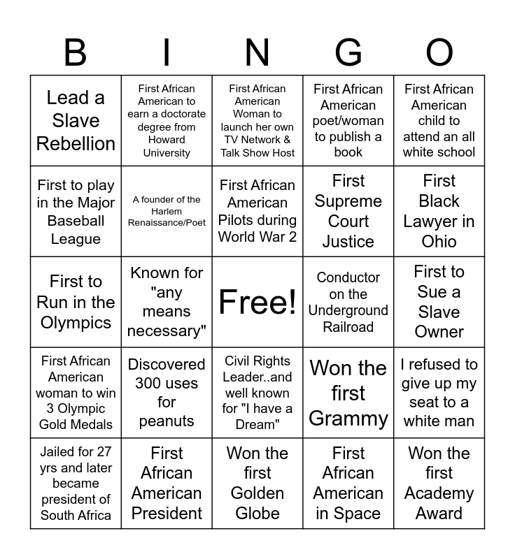 This bingo card has a free space and 24 words: Discovered 300 uses for peanuts, First African American President, First African American Pilots during World War 2, Jailed for 27 yrs and later became president of South Africa, First African American child to attend an all white school, Lead a Slave Rebellion, First to play in the Major Baseball League, First African American to earn a doctorate degree from Howard University, Conductor on the Underground Railroad, Civil Rights Leader..and well known for "I have a Dream", First Supreme Court Justice, First to Run in the Olympics, Won the first Grammy, I refused to give up my seat to a white man, A founder of the Harlem Renaissance/Poet, First African American in Space, First to Sue a Slave Owner, First African American Woman to launch her own TV Network & Talk Show Host, First Black Lawyer in Ohio, Known for "any means necessary", Won the first Academy Award, First African American woman to win 3 Olympic Gold Medals, First African American poet/woman to publish a book and Won the first Golden Globe.