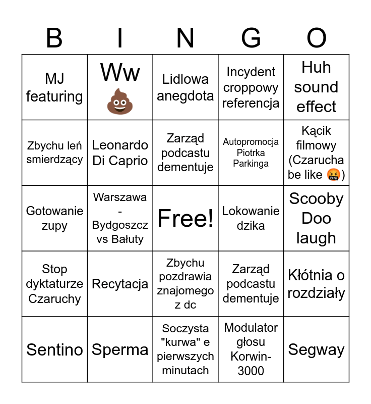 This bingo card has a free space and 24 words: Recytacja, Sperma, Zarząd podcastu dementuje, Sentino, Huh sound effect, MJ featuring, Zbychu leń smierdzący, Ww 💩, Lokowanie dzika, Zbychu pozdrawia znajomego z dc, Autopromocja Piotrka Parkinga, Gotowanie zupy, Zarząd podcastu dementuje, Kłótnia o rozdziały, Leonardo Di Caprio, Modulator głosu Korwin-3000, Scooby Doo laugh, Lidlowa anegdota, Kącik filmowy (Czarucha be like 🤬), Warszawa - Bydgoszcz vs Bałuty, Segway, Stop dyktaturze Czaruchy, Incydent croppowy referencja and Soczysta "kurwa" e pierwszych minutach.
