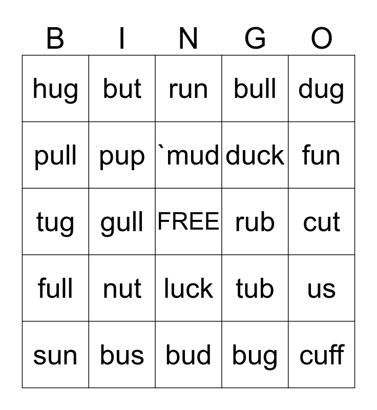 This bingo card has a free space and 24 words: nut, bus, `mud, sun, dug, hug, pull, but, rub, luck, duck, tug, tub, us, pup, bug, cut, run, fun, gull, cuff, full, bull and bud.