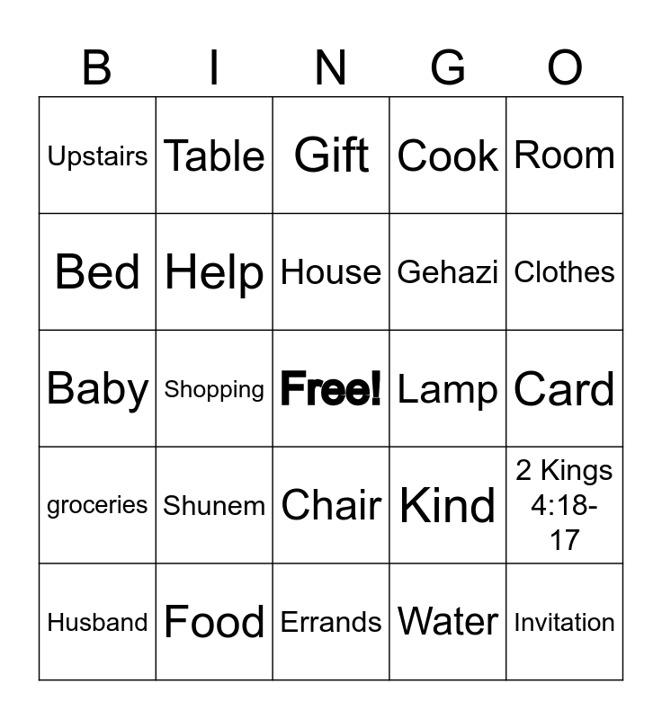 This bingo card has a free space and 24 words: Shunem, Food, House, Husband, Room, Upstairs, Bed, Table, Lamp, Chair, Gehazi, Baby, Kind, 2 Kings 4:18-17, Help, Water, Card, Gift, Clothes, Shopping, Invitation, groceries, Cook and Errands.