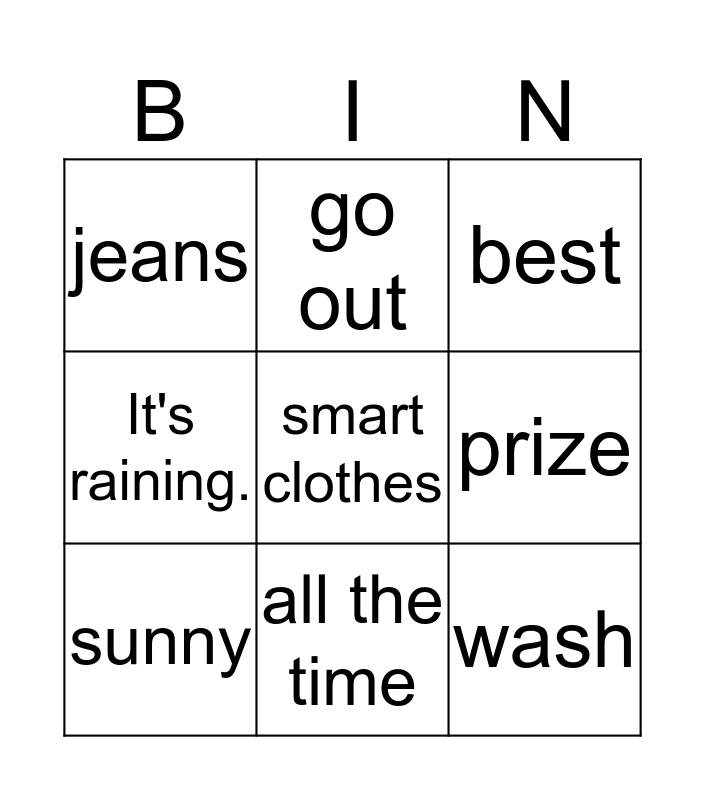 This bingo card has 9 words: sunny, best, go out, It's raining., jeans, prize, smart clothes, wash and all the time.