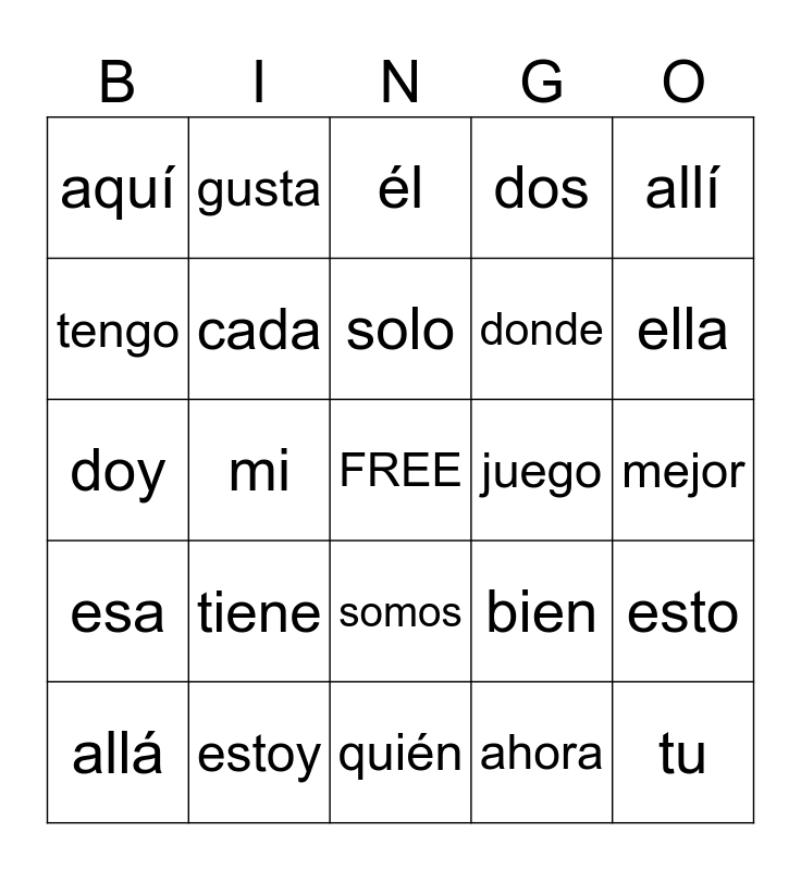 This bingo card has a free space and 24 words: tiene, estoy, solo, allá, allí, aquí, tengo, gusta, juego, somos, donde, doy, bien, esto, cada, ahora, mejor, él, ella, mi, tu, esa, dos and quién.