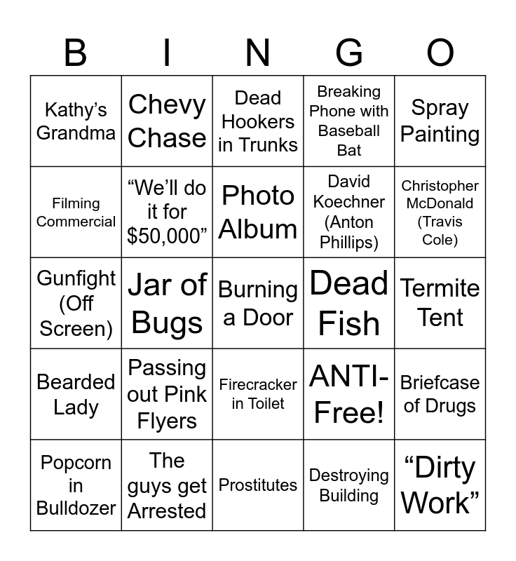 This bingo card has 27 words: ANTI-Free!, “Dirty Work”, David Koechner (Anton Phillips), Prostitutes, Filming Commercial, Dead Hookers in Trunks, Chevy Chase, Bearded Lady, Dead Fish, Briefcase of Drugs, Gunfight (Off Screen), Breaking Phone with Baseball Bat, Popcorn in Bulldozer, The guys get Arrested, Christopher McDonald (Travis Cole), Travis Cole offers the guys a Job, “We’ll do it for $50,000”, Photo Album, Passing out Pink Flyers, Kathy’s Grandma, Termite Tent, Destroying Building, Jar of Bugs, Burning a Door, Firecracker in Toilet, Spray Painting and THIS PLACE SUCKS.