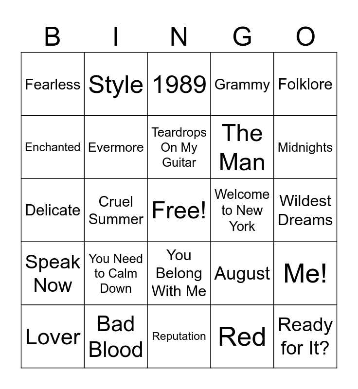 This bingo card has a free space and 29 words: Lover, Shake it Off, Cruel Summer, Blank Space, Fearless, 1989, Evermore, You Need to Calm Down, Welcome to New York, Bad Blood, Wildest Dreams, Ready for It?, Reputation, Red, Midnights, Love Story, You Belong With Me, Speak Now, Folklore, Delicate, August, Anti-Hero, The Man, Enchanted, Grammy, Style, Me!, Teardrops On My Guitar and Guitar.