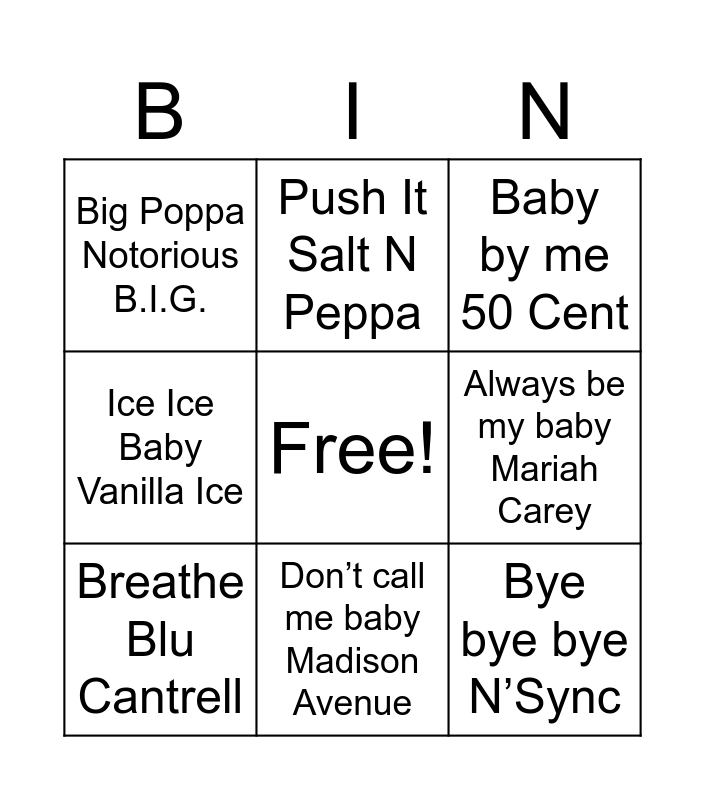 This bingo card has a free space and 29 words: Always on time Ashtani / Ja Rule, Babyshark, Baby Doll Kanika Kapoor, One more time Britney Spears, Big Poppa Notorious B.I.G., Baby by me 50 Cent, Breathe Blu Cantrell, Dilemma Nelly / Kelly, Never Leave You Lumidee, Rock wit you Ashtani, If it’s lovin that you want Rihanna, Round Round Sugababes, J-Lo If you had my love, Hero Enrique Iglesias, Genie in a bottle Christina Aguilera, I saw mommy kissing Santa Clause The Jackson 5, Burn Usher, Mamma Spice Girls, Bye bye bye N’Sync, Baby Justin Bieber, Baby got back Sir Mix-A-Lot, Mamma Mia ABBA, Baby Boy Beyonce, Always be my baby Mariah Carey, Ice Ice Baby Vanilla Ice, Push It Salt N Peppa, Babycakes 3 of a kind, Don’t call me baby Madison Avenue and Hey Ma Cam’Ron.