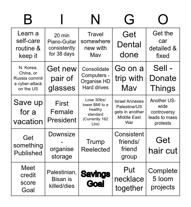 This bingo card has 25 words: Get something Published, Palestinian, Bisan is killed/dies, Lose 30lbs/ lower BMI to a healthy standard (Currently 162 Lbs), Put necklace together, Get the car detailed & fixed, Learn a self-care routine & keep it, 20 min Piano-Guitar consistently for 38 days, Travel somewhere new with Mav, Israel Annexes Palestine/US gets in another Middle East War, Get hair cut, N. Korea, China, or Russia commit a cyber-attack on the US, Get new pair of glasses, Savings Goal, Consistent friends/ friend group, Sell -Donate Things, Meet credit score Goal, First Female President, Consolidate Computers -Organise HD Hard drives, Go on a trip with Mav, Another US-wide controversy leads to mass protests, Save up for a vacation, Downsize - organise storage, Trump Reelected, Get Dental done and Complete 5 loom projects.