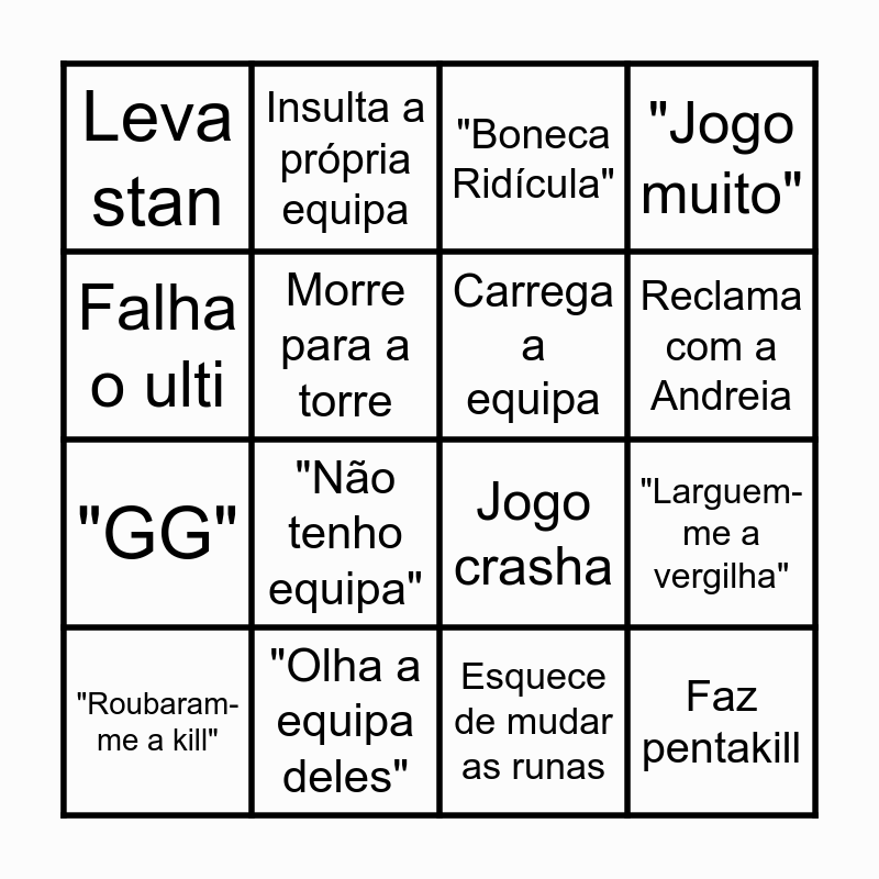 This bingo card has 16 words: "Olha a equipa deles", "Larguem-me a vergilha", "Boneca Ridícula", Leva stan, "GG", Insulta a própria equipa, Jogo crasha, Esquece de mudar as runas, Falha o ulti, Morre para a torre, "Roubaram-me a kill", "Jogo muito", "Não tenho equipa", Reclama com a Andreia, Carrega a equipa and Faz pentakill.