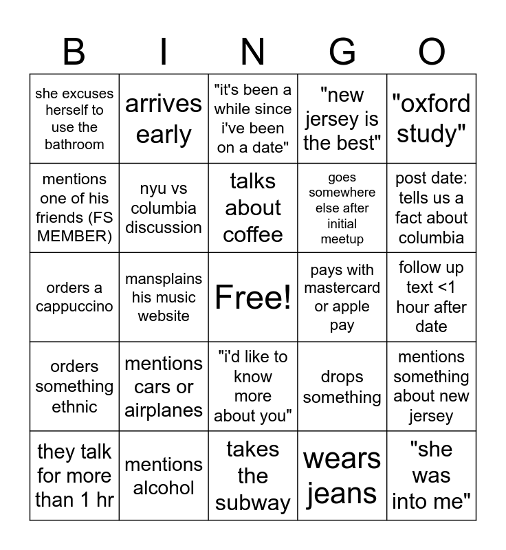 This bingo card has a free space and 24 words: mentions cars or airplanes, mentions alcohol, talks about coffee, they talk for more than 1 hr, "oxford study", she excuses herself to use the bathroom, mentions one of his friends (FS MEMBER), arrives early, pays with mastercard or apple pay, "i'd like to know more about you", goes somewhere else after initial meetup, orders a cappuccino, drops something, mentions something about new jersey, nyu vs columbia discussion, wears jeans, follow up text <1 hour after date, "it's been a while since i've been on a date", post date: tells us a fact about columbia, mansplains his music website, "she was into me", orders something ethnic, "new jersey is the best" and takes the subway.