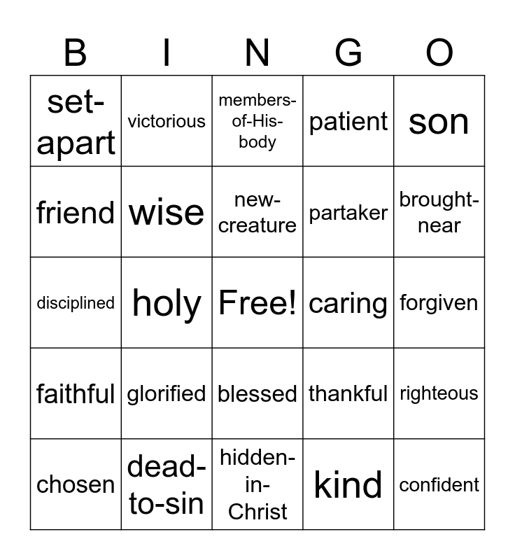This bingo card has a free space and 67 words: citizens-of-heaven, bought, overcomer, righteous, prudent, redeemed, victorious, alive, new-creature, free, blessed, heirs, forgiven, son, daughter, friend, holy, set-apart, qualified, partaker, glorified, faithful, patient, kind, adopted, Spirit-filled, empowered, transformed, brought-near, His-image, confident, conqueror, saved, perfected, called, chosen, peaceful, thankful, disciplined, fruit-bearer, rich, wise, caring, whole, raised, His-workmanship, seated-with-Him, dead-to-sin, vessel-of-mercy, united, members-of-His-body, clothed-in-Him, disciple, baptized-into-Him, anointed, hidden-in-Christ, accepted, reconciled, restored, His-temple, salt, complete, justified, light, beloved, sanctified and strong.