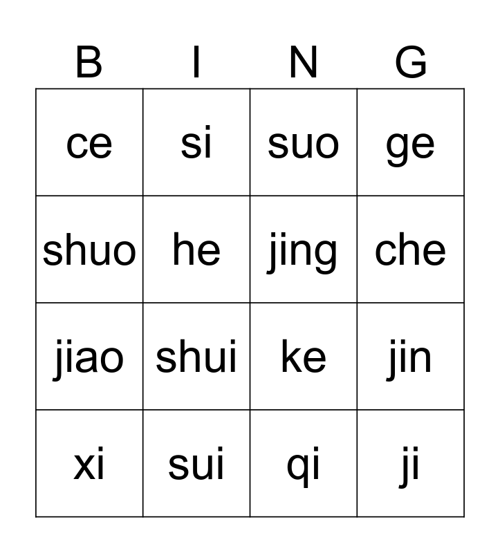 This bingo card has 16 words: xi, sui, suo, ge, shuo, si, ke, jin, ce, he, qi, che, jiao, shui, jing and ji.