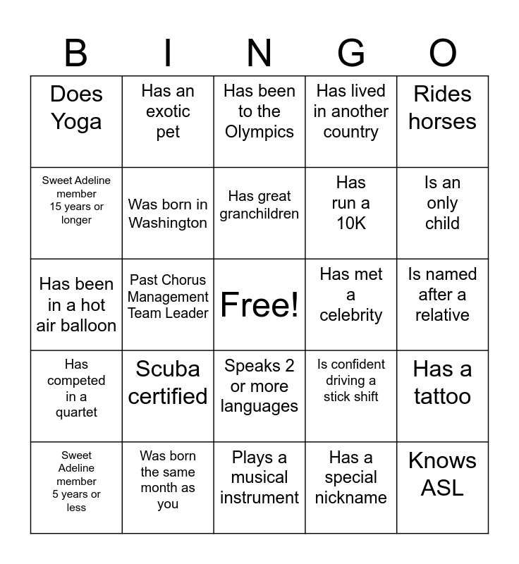 This bingo card has a free space and 29 words: Sweet Adeline member 5 years or less, Is self-employed, Past Chorus Management Team Leader, Loves to garden, Does Yoga, Has been to the Olympics, Was born in Washington, Scuba certified, Has met a celebrity, Was born the same month as you, Is named after a relative, Knows ASL, Plays a musical instrument, Has a special nickname, Is an only child, Loves roller coasters, Speaks 2 or more languages, Has competed in a quartet, Rides horses, Has been in a hot air balloon, Is confident driving a stick shift, Was the lead in a play, Has run a 10K, Sweet Adeline member 15 years or longer, Has lived in another country, Has an exotic pet, Has a tattoo, Has great granchildren and Can tap dance.