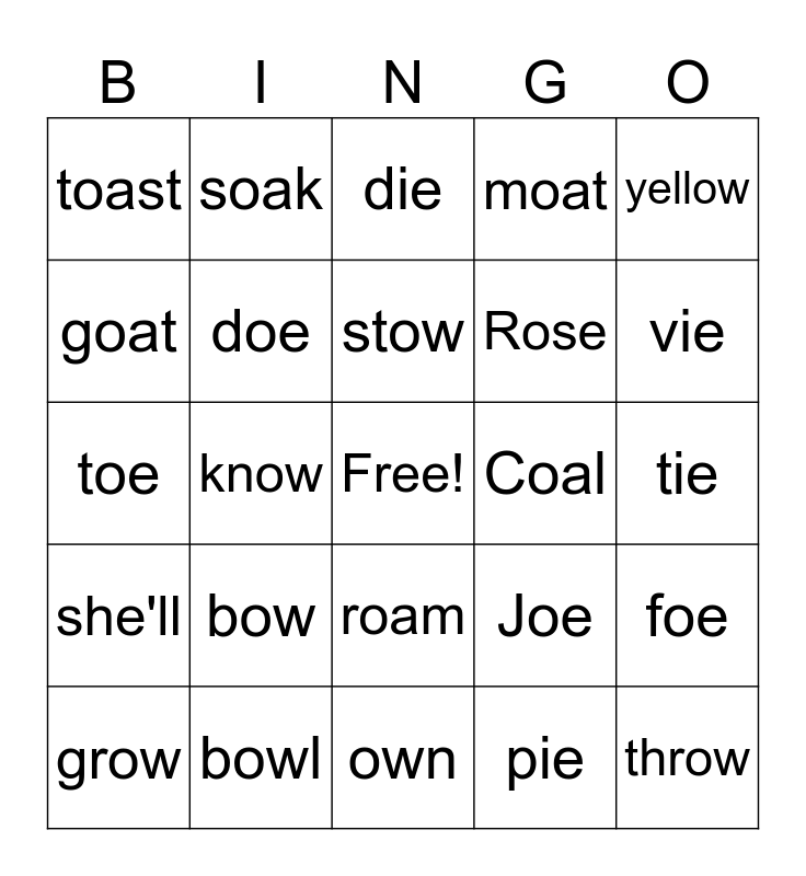 This bingo card has a free space and 24 words: bow, bowl, stow, grow, yellow, toast, goat, soak, Coal, roam, Rose, toe, Joe, foe, doe, pie, tie, die, vie, know, throw, she'll, moat and own.