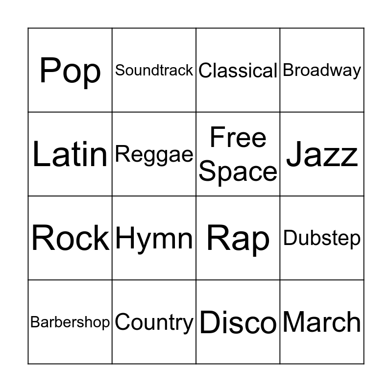 This bingo card has 16 words: Country, Dubstep, Classical, Pop, Rock, Soundtrack, Rap, Disco, Latin, Reggae, Barbershop, Broadway, Hymn, Jazz, Free Space and March.