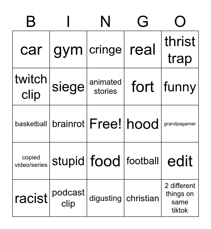 This bingo card has a free space and 24 words: stupid, podcast clip, animated stories, racist, thrist trap, car, twitch clip, gym, hood, food, fort, basketball, football, edit, siege, christian, grandpagamer, cringe, funny, brainrot, 2 different things on same tiktok, copied video/series, real and digusting.