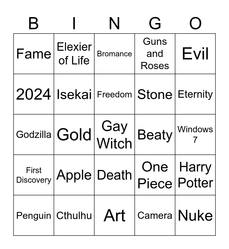 This bingo card has a free space and 24 words: Apple, Cthulhu, Freedom, Penguin, Evil, Fame, 2024, Elexier of Life, Beaty, Death, Stone, Godzilla, One Piece, Harry Potter, Isekai, Camera, Windows 7, Bromance, Eternity, Gold, Nuke, First Discovery, Guns and Roses and Art.