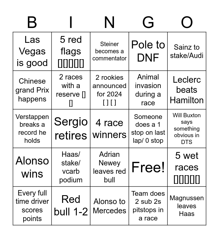 This bingo card has 25 words: Haas/ stake/ vcarb podium, Alonso to Mercedes, 2 rookies announced for 2024 [ ] [ ], Every full time driver scores points, Sainz to stake/Audi, Las Vegas is good, Chinese grand Prix happens, 5 red flags [][][][][], Someone does a 1 stop on last lap/ 0 stop, Adrian Newey leaves red bull, Animal invasion during a race, Verstappen breaks a record he holds, Free!, 5 wet races [][][][][], 2 races with a reserve [][], Magnussen leaves Haas, Will Buxton says something obvious in DTS, Steiner becomes a commentator, Leclerc beats Hamilton, Sergio retires, 4 race winners, Red bull 1-2, Alonso wins, Pole to DNF and Team does 2 sub 2s pitstops in a race.