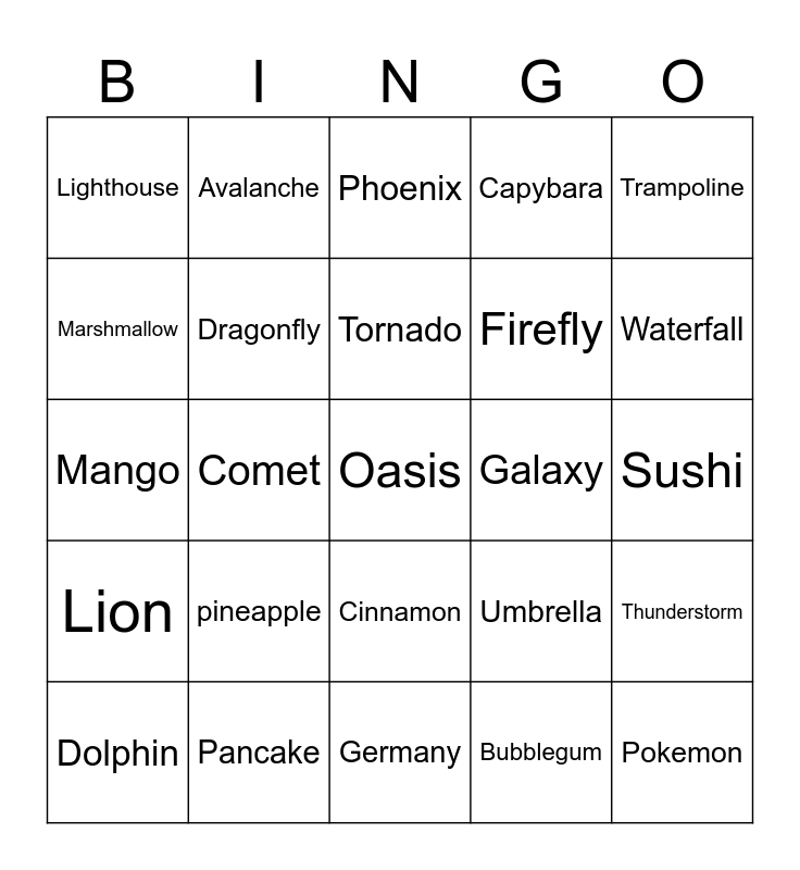 This bingo card has a free space and 24 words: pineapple, Pancake, Tornado, Dolphin, Trampoline, Lighthouse, Marshmallow, Avalanche, Galaxy, Cinnamon, Firefly, Mango, Umbrella, Thunderstorm, Dragonfly, Bubblegum, Sushi, Phoenix, Waterfall, Comet, Pokemon, Lion, Capybara and Germany.