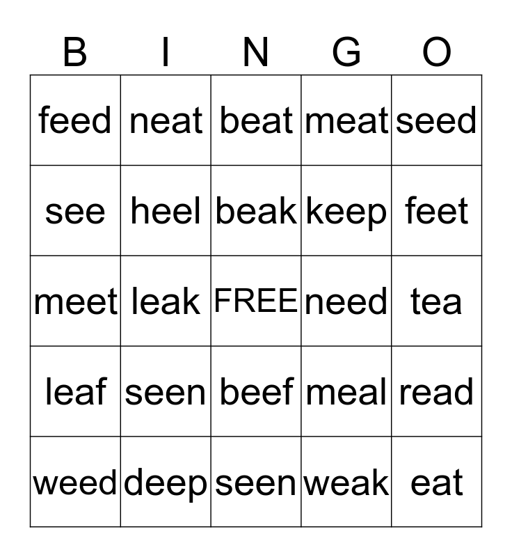 This bingo card has a free space and 24 words: seen, deep, beak, weed, seed, feed, see, neat, need, beef, keep, meet, meal, read, heel, weak, tea, beat, feet, leak, eat, leaf, meat and seen.