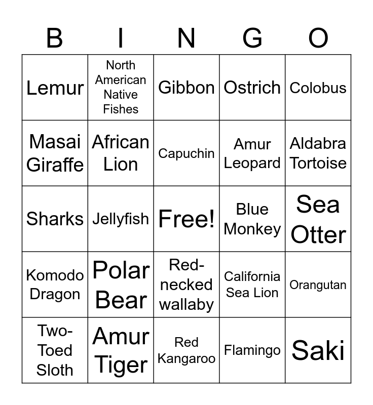 This bingo card has a free space and 61 words: Canadian Lynx, Amur Tiger, Red Panda, Komodo Dragon, Flamingo, Black Rhinoceros, African Lion, Galapagos Tortoise, Amur Leopard, Nyala, Ostrich, African Elephant, Masai Giraffe, Grant’s Zebra, Cheetah, Lemur, Saki, Colobus, Black Howler, Capuchin, Blue Monkey, Gibbon, Two-Toed Sloth, Orangutan, Western Lowland Gorilla, Philippine Crocodile, False gharial, Siamang, Aldabra Tortoise, Visayan Warty Pig, Clouded Leopard, Giant Anteater, Ocelot, Fossa, North American Native Fishes, Sea Turtles, Penguins, Jellyfish, Eels, Sharks, Stingrays, Polar Bear, Sea Otter, Northern Elephant Seal, California Sea Lion, Alpaca, River Otter, Beaver, Barn Owl, Red-necked wallaby, Red Kangaroo, Alligator, Kunekune Pig, Donkey, Goat, Venomous Reptiles, Lake Malawi Cichlids, Yellow-Footed Tortoise, Naked Mole-Rat, Bat and Meerkat.