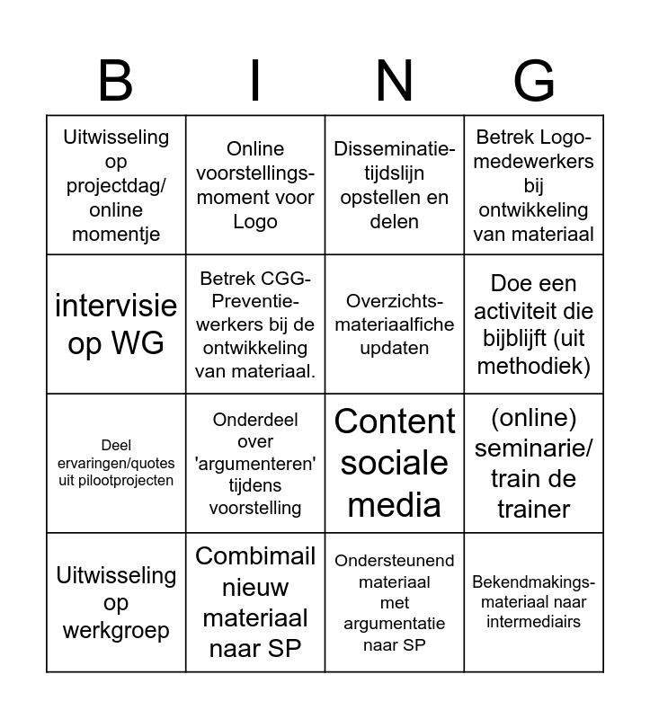 This bingo card has 21 words: Combimail nieuw materiaal naar SP, Nieuwsbrief preventie, Online voorstellings-moment voor Logo, workshop op projectdag Logo's, Ondersteunend materiaal met argumentatie naar SP, Overzichts-materiaalfiche updaten, Uitwisseling op projectdag/ online momentje, Disseminatie-tijdslijn opstellen en delen, Content sociale media, Doe een activiteit die bijblijft (uit methodiek), Deel ervaringen/quotes uit pilootprojecten, Betrek Logo-medewerkers bij ontwikkeling van materiaal, Bekendmakings- materiaal naar intermediairs, ondersteunend bekendmakings-materiaal beschikbaar, Betrek CGG-Preventie-werkers bij de ontwikkeling van materiaal., Voorstelling op werkgroep preventieteam, Uitwisseling op werkgroep, Onderdeel over 'argumenteren' tijdens voorstelling, intervisie op WG, (online) seminarie/ train de trainer and Verwijs naar bestaand vormingsaanbod.