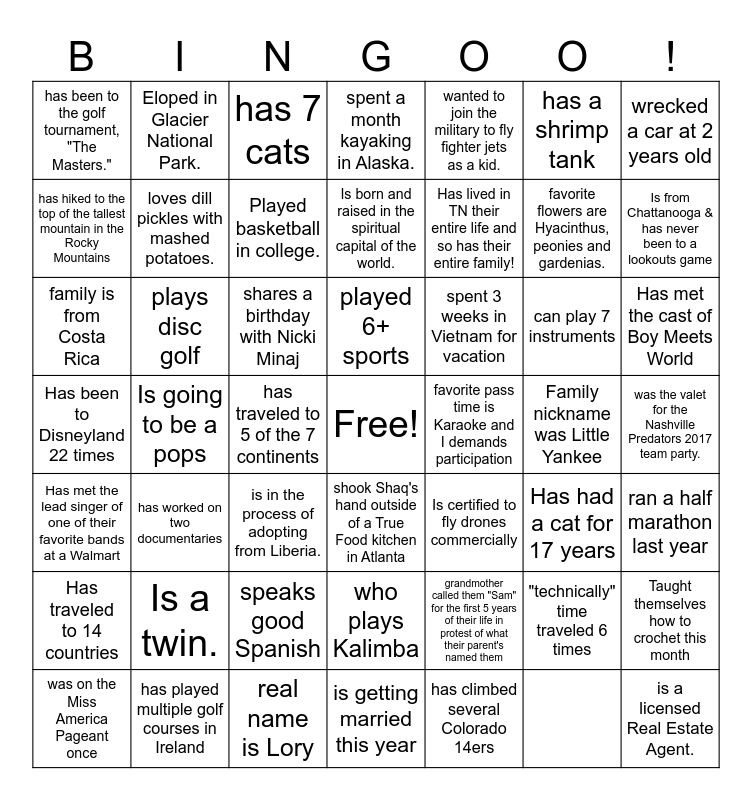 This bingo card has a free space and 49 words: Has traveled to 14 countries, plays disc golf, speaks good Spanish, is getting married this year, Is certified to fly drones commercially, Family nickname was Little Yankee, wrecked a car at 2 years old, was on the Miss America Pageant once, loves dill pickles with mashed potatoes., shares a birthday with Nicki Minaj, spent a month kayaking in Alaska., Has lived in TN their entire life and so has their entire family!, favorite flowers are Hyacinthus, peonies and gardenias., Has met the cast of Boy Meets World, Has met the lead singer of one of their favorite bands at a Walmart, Is a twin., has 7 cats, played 6+ sports, has climbed several Colorado 14ers, has a shrimp tank, Is from Chattanooga & has never been to a lookouts game, family is from Costa Rica, Eloped in Glacier National Park., Played basketball in college., loves to cook, spent 3 weeks in Vietnam for vacation, can play 7 instruments, is a licensed Real Estate Agent., has been to the golf tournament, "The Masters.", Is going to be a pops, real name is Lory, shook Shaq's hand outside of a True Food kitchen in Atlanta, grandmother called them "Sam" for the first 5 years of their life in protest of what their parent's named them, ran a half marathon last year, has hiked to the top of the tallest mountain in the Rocky Mountains, has played multiple golf courses in Ireland, has traveled to 5 of the 7 continents, who plays Kalimba, favorite pass time is Karaoke and I demands participation, Has had a cat for 17 years, Taught themselves how to crochet this month, Has been to Disneyland 22 times, has worked on two documentaries, is in the process of adopting from Liberia., Is born and raised in the spiritual capital of the world., wanted to join the military to fly fighter jets as a kid., "technically" time traveled 6 times, was the valet for the Nashville Predators 2017 team party. and started their career in Fashion and Home furnishing industry..