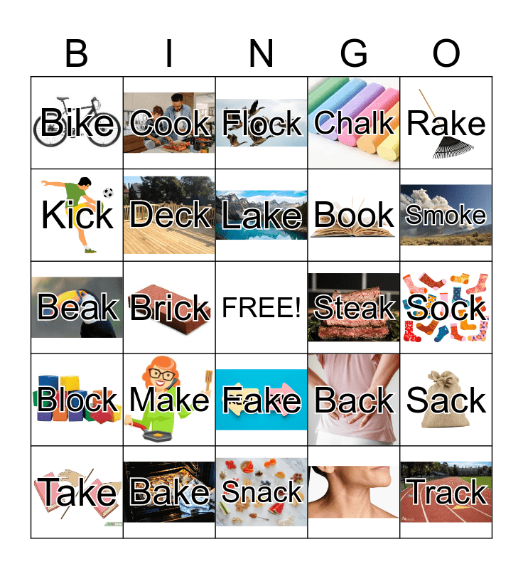 This bingo card has 24 images, a free space and 23 words: Make, Bake, Lake, Take, Rake, Bike, Kick, Cook, Steak, Fake, Book, Beak, Back, Sack, Deck, Sock, Flock, Smoke, Brick, Track, Block, Chalk and Snack.