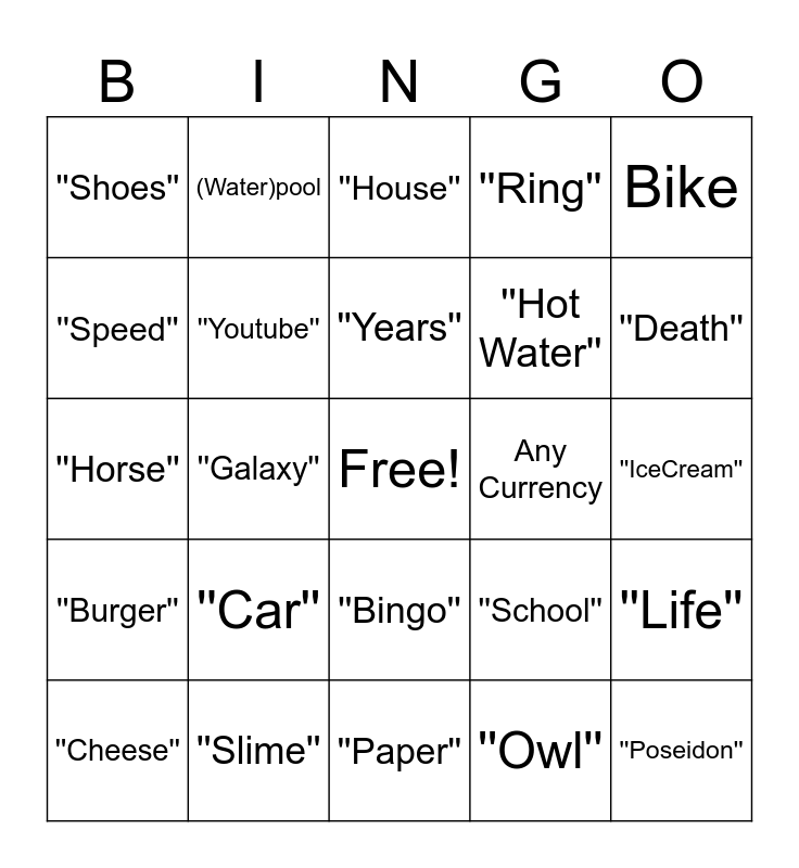 This bingo card has a free space and 24 words: ''Car'', ''Slime'', ''Years'', ''Cheese'', Bike, ''Shoes'', ''Speed'', (Water)pool, Any Currency, ''Bingo'', ''Hot Water'', ''Horse'', ''School'', ''Life'', ''Youtube'', ''Owl'', ''IceCream'', ''House'', ''Death'', ''Galaxy'', ''Poseidon'', ''Burger'', ''Ring'' and ''Paper''.