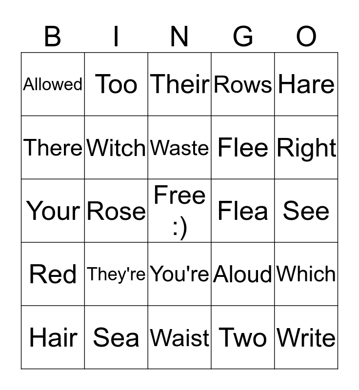 This bingo card has a free space and 24 words: They're, Sea, Waste, Hair, Hare, Allowed, There, Too, Flea, You're, Flee, Your, Aloud, Which, Witch, Two, See, Their, Right, Rose, Write, Red, Rows and Waist.