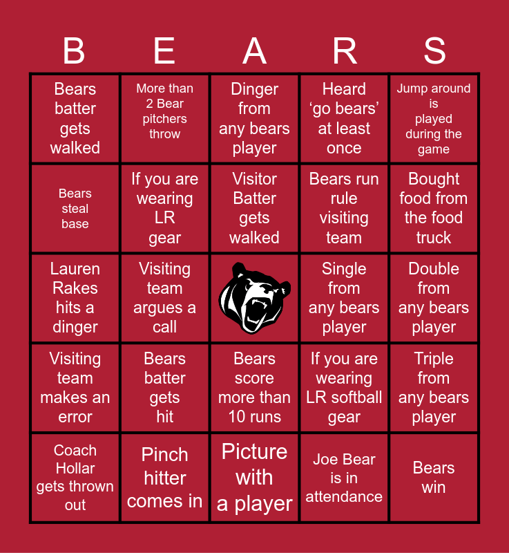 This bingo card has a free space and 24 words: Coach Hollar gets thrown out, Bears batter gets hit, Visitor Batter gets walked, Joe Bear is in attendance, Jump around is played during the game, Bears batter gets walked, More than 2 Bear pitchers throw, Dinger from any bears player, Single from any bears player, Double from any bears player, Lauren Rakes hits a dinger, If you are wearing LR gear, If you are wearing LR softball gear, Triple from any bears player, Bears steal base, Pinch hitter comes in, Picture with a player, Heard ‘go bears’ at least once, Bought food from the food truck, Visiting team makes an error, Visiting team argues a call, Bears score more than 10 runs, Bears run rule visiting team and Bears win.