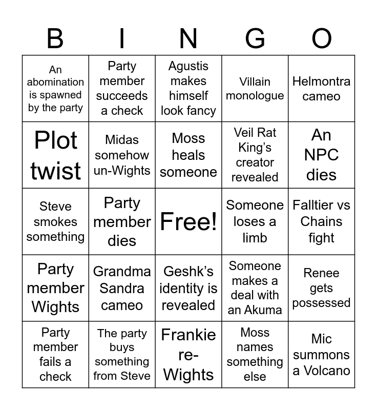 This bingo card has a free space and 31 words: Frankie re-Wights, Moss finds their dad, Party member dies, Quincy does something sociopathic, An abomination is spawned by the party, Agustis makes himself look fancy, Midas somehow un-Wights, Someone makes a deal with an Akuma, Someone loses a limb, Moss names something else, Falltier vs Chains fight, Mic summons a Volcano, We meet a third Akuma, Ace’s age is revealed, An NPC dies, Enemy gets one-shot before villain monologue, Renee gets possessed, Grandma Sandra cameo, Party member Wights, Geshk’s identity is revealed, Helmontra cameo, Deceiver encounter, Party member fails a check, Party member succeeds a check, Veil Rat King’s creator revealed, Plot twist, Villain monologue, Steve smokes something, The party buys something from Steve, Moss heals someone and Mic heals someone.