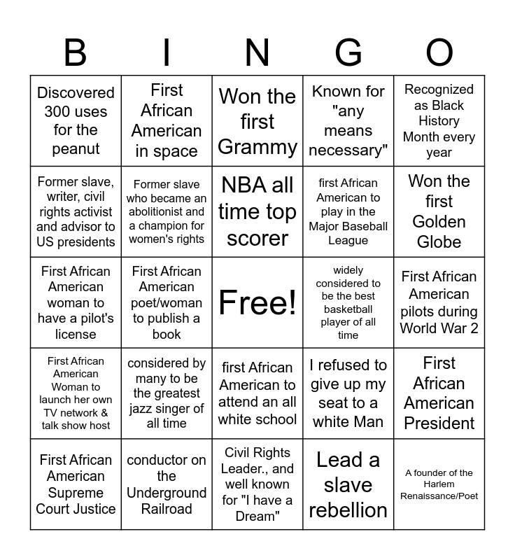 This bingo card has a free space and 24 words: considered by many to be the greatest jazz singer of all time, conductor on the Underground Railroad, NBA all time top scorer, First African American Supreme Court Justice, Recognized as Black History Month every year, Discovered 300 uses for the peanut, Former slave, writer, civil rights activist and advisor to US presidents, First African American in space, widely considered to be the best basketball player of all time, first African American to attend an all white school, first African American to play in the Major Baseball League, First African American woman to have a pilot's license, I refused to give up my seat to a white Man, First African American President, Former slave who became an abolitionist and a champion for women's rights, Lead a slave rebellion, First African American pilots during World War 2, Won the first Grammy, Won the first Golden Globe, First African American poet/woman to publish a book, A founder of the Harlem Renaissance/Poet, First African American Woman to launch her own TV network & talk show host, Known for "any means necessary" and Civil Rights Leader., and well known for "I have a Dream".