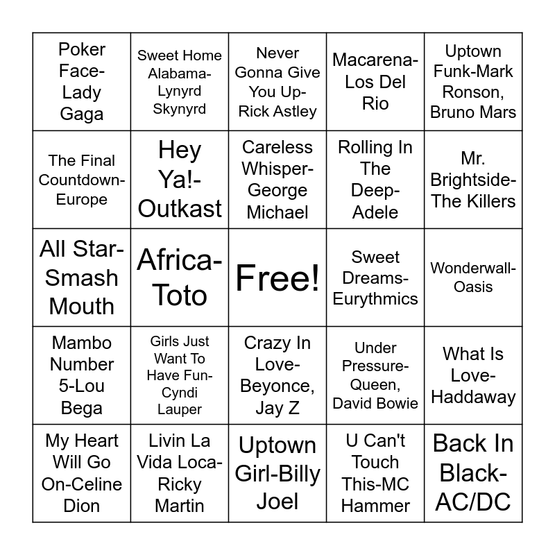 This bingo card has a free space and 75 words: Bohemian Rhapsody-Queen, Billie Jean-Michael Jackson, Never Gonna Give You Up-Rick Astley, Smells Like Teen Spirit-Nirvana, Stayin Alive-Bee Gees, Take On Me-a ha, Don't Stop Believin'-Journey, Eye of the Tiger-Survivor, Livin' On A Prayer-Bon Jovi, Lose Yourself-Eminem, Dancing Queen-ABBA, YMCA-Village People, Careless Whisper-George Michael, The Final Countdown-Europe, Viva La Vida-Coldplay, Africa-Toto, Gangnam Style-PSY, Back In Black-AC/DC, Seven Nation Army-The White Stripes, Uptown Funk-Mark Ronson, Bruno Mars, I Will Always Love You-Whitney Houston, All Star-Smash Mouth, Hey Ya!-Outkast, Sweet Home Alabama-Lynyrd Skynyrd, Macarena-Los Del Rio, ...Baby One More Time-Britney Spears, I Want It That Way-Backstreet Boys, Blinding Lights-The Weeknd, In The End-Linkin Park, I'm Still Standing-Elton John, Somebody That I Used To Know-Gotye, Kimbra, Dream On-Aerosmith, Hey Jude-The Beatles, Under Pressure-Queen, David Bowie, Mr. Brightside-The Killers, Rolling In The Deep-Adele, Every Breath You Take-The Police, Hotel California-Eagles, Wonderwall-Oasis, U Can't Touch This-MC Hammer, Get Lucky-Daft Punk, I Wanna Dance With Somebody-Whitney Houston, Sweet Caroline-Neil Diamond, I Gotta Feeling-Black Eyed Peas, Stairway To Heaven-Led Zeppelin, Wake Me Up Before You Go-Go-Wham!, My Heart Will Go On-Celine Dion, Poker Face-Lady Gaga, Hips Don't Lie-Shakira, Wake Me Up-Avicii, Wannabe-Spice Girls, Crazy In Love-Beyonce, Jay Z, Call Me Maybe-Carly Rae Jepson, Ghostbusters-Ray Parker Jr., Boulevard of Broken Dreams-Green Day, In Da Club-50 Cent, Umbrella-Rihanna, Jay Z, Jailhouse Rock-Elvis Presley, Happy-Pharrell Williams, Blue-Eiffel 65, Girls Just Want To Have Fun-Cyndi Lauper, Barbie Girl-Aqua, Oops!...I Did It Again-Britney Spears, Thriller-Michael Jackson, Don't Stop Me Now-Queen, Sweet Dreams-Eurythmics, The Real Slim Shady-Eminem, I Will Survive-Gloria Gaynor, The House Of The Rising Sun-The Animals, What Is Love-Haddaway, Mambo Number 5-Lou Bega, Livin La Vida Loca-Ricky Martin, Karma Chameleon-Culture Club, Uptown Girl-Billy Joel and Firework-Katy Perry.