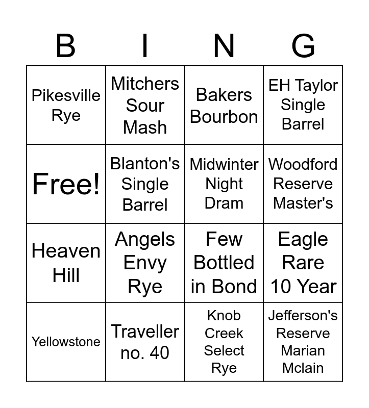 This bingo card has 16 words: Traveller no. 40, Eagle Rare 10 Year, Bakers Bourbon, Pikesville Rye, Heaven Hill, Mitchers Sour Mash, Few Bottled in Bond, Knob Creek Select Rye, Free!, Blanton's Single Barrel, Yellowstone, EH Taylor Single Barrel, Angels Envy Rye, Woodford Reserve Master's, Midwinter Night Dram and Jefferson's Reserve Marian Mclain.