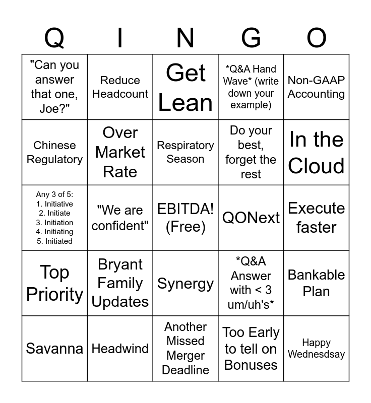 This bingo card has a free space and 24 words: Bryant Family Updates, Headwind, Respiratory Season, Savanna, Non-GAAP Accounting, "Can you answer that one, Joe?", Chinese Regulatory, Reduce Headcount, QONext, Synergy, Do your best, forget the rest, Any 3 of 5: 1. Initiative 2. Initiate 3. Initiation 4. Initiating 5. Initiated, *Q&A Answer with < 3 um/uh's*, Bankable Plan, Over Market Rate, Too Early to tell on Bonuses, Execute faster, Get Lean, In the Cloud, "We are confident", Happy Wednesdsay, Top Priority, *Q&A Hand Wave* (write down your example) and Another Missed Merger Deadline.