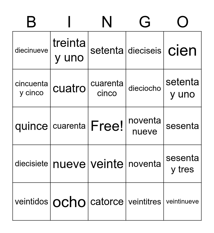 This bingo card has a free space and 24 words: nueve, ocho, cuarenta cinco, veintidos, cien, diecinueve, cincuenta y cinco, treinta y uno, noventa nueve, veinte, dieciocho, quince, noventa, sesenta y tres, cuatro, veintitres, sesenta, setenta, setenta y uno, cuarenta, veintinueve, diecisiete, dieciseis and catorce.