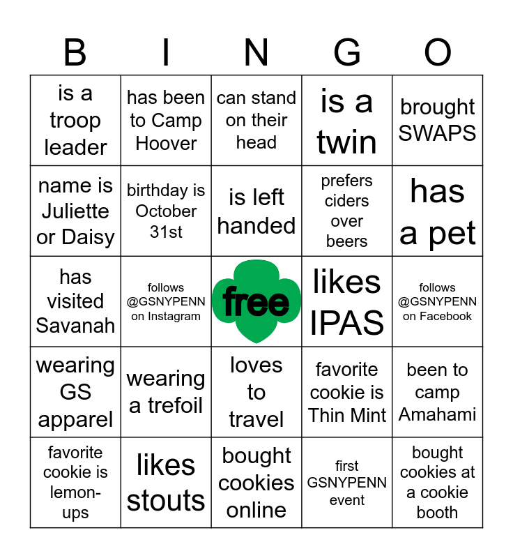 This bingo card has a free space and 24 words: favorite cookie is lemon-ups, wearing a trefoil, is left handed, first GSNYPENN event, brought SWAPS, is a troop leader, has been to Camp Hoover, can stand on their head, likes IPAS, follows @GSNYPENN on Facebook, has visited Savanah, birthday is October 31st, favorite cookie is Thin Mint, been to camp Amahami, name is Juliette or Daisy, likes stouts, bought cookies online, is a twin, has a pet, wearing GS apparel, follows @GSNYPENN on Instagram, loves to travel, prefers ciders over beers and bought cookies at a cookie booth.