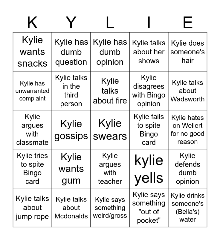 This bingo card has a free space and 27 words: kylie yells, Kylie sits on Bella's lap, Kylie disagrees with Bingo opinion, Kylie says something weird/gross, Kylie has unwarranted complaint, Kylie has dumb opinion, Kylie has dumb question, Kylie tries to spite Bingo card, Kylie fails to spite Bingo card, Kylie defends dumb opinion, Kylie argues with classmate, Kylie talks about her shows, Kylie talks about jump rope, Kylie talks about Mcdonalds, Kylie talks about Wadsworth, Kylie says "Brian", Kylie talks in the third person, Kylie talks about fire, Kylie wants gum, Kylie wants snacks, Kylie hates on Wellert for no good reason, Kylie says something "out of pocket", Kylie gossips, Kylie drinks someone's (Bella's) water, Kylie argues with teacher, Kylie does someone's hair and Kylie talks about one of her "Cuties".