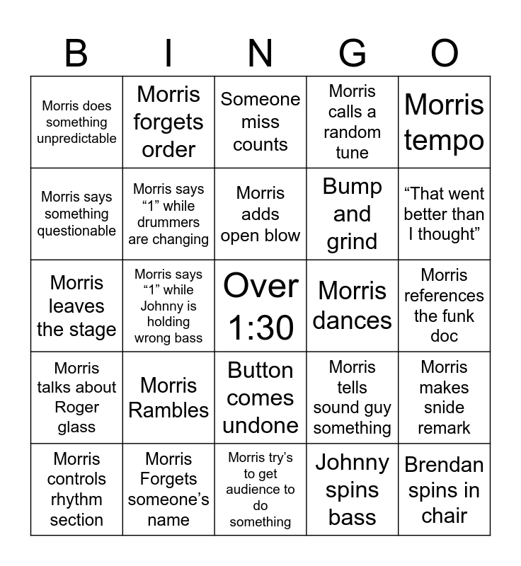 This bingo card has a free space and 24 words: Morris Rambles, Morris Forgets someone’s name, Morris adds open blow, Morris controls rhythm section, Morris tempo, Morris does something unpredictable, Morris says something questionable, Morris forgets order, Morris dances, Button comes undone, Bump and grind, Morris leaves the stage, Morris tells sound guy something, Morris makes snide remark, Morris says “1” while drummers are changing, Johnny spins bass, Morris references the funk doc, Someone miss counts, “That went better than I thought”, Morris says “1” while Johnny is holding wrong bass, Brendan spins in chair, Morris talks about Roger glass, Morris calls a random tune and Morris try’s to get audience to do something.