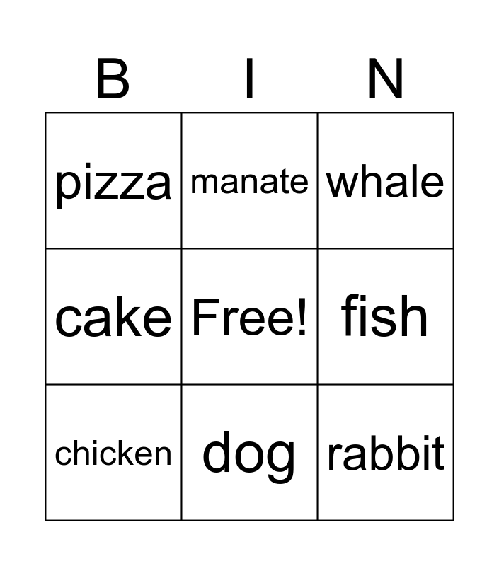 This bingo card has a free space and 11 words: cat, dog, rabbit, chicken, manate, whale, fish, snake, cake, pizza and beverages.